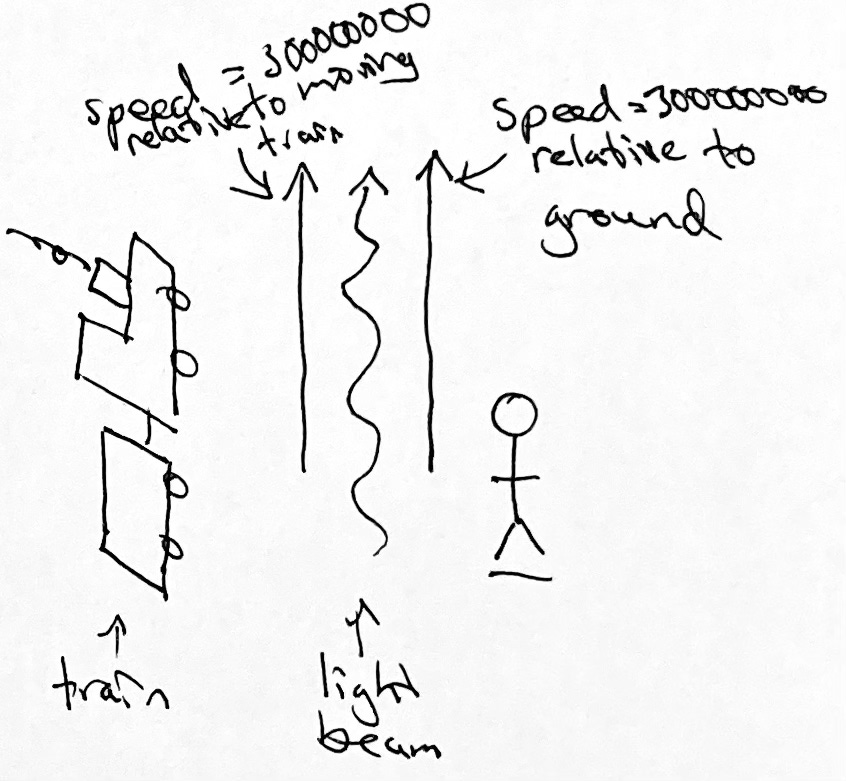 So let’s do that with light. I’m on a train, going north at speed 1, and you’re on the ground shining a beam of light northward. I measure the speed of the light, which turns out to be2 300,000,000. You measure the speed of the light, and you also get 300,000,000 because the speed of light is the same for all observers3. So my speed must be your measurement minus my measurement, like before with that train that was going at speed 3 relative to me. So my speed is 0. So 0 equals 1.