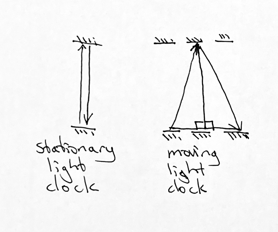 If the “light clock” is moving at a low speed, then these triangles are going to be pretty narrow, so the hypotenuse won’t be that much longer, but it will be a little bit longer. The light is still travelling at the same speed—it has to—so the clock will be just a teensy bit slower to measure its 0.000000001 units of time. This is one of the simplest ways to see one of the most well-known facts about relativistic physics. Moving clocks run slow, whether they are “light clocks” or not5.