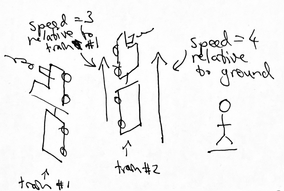 Look at it like this. If I’m on train #1, going north, and I see train #2 going north at what to me looks like a speed of 3 units, and you’re on the ground and you see the same train #2 going north at 4 units, then my speed must be your measurement minus my measurement, right? So my speed is 1.